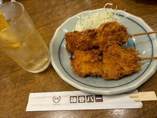 串カツと電気ソーダ。あとマカロニグラタンもね。