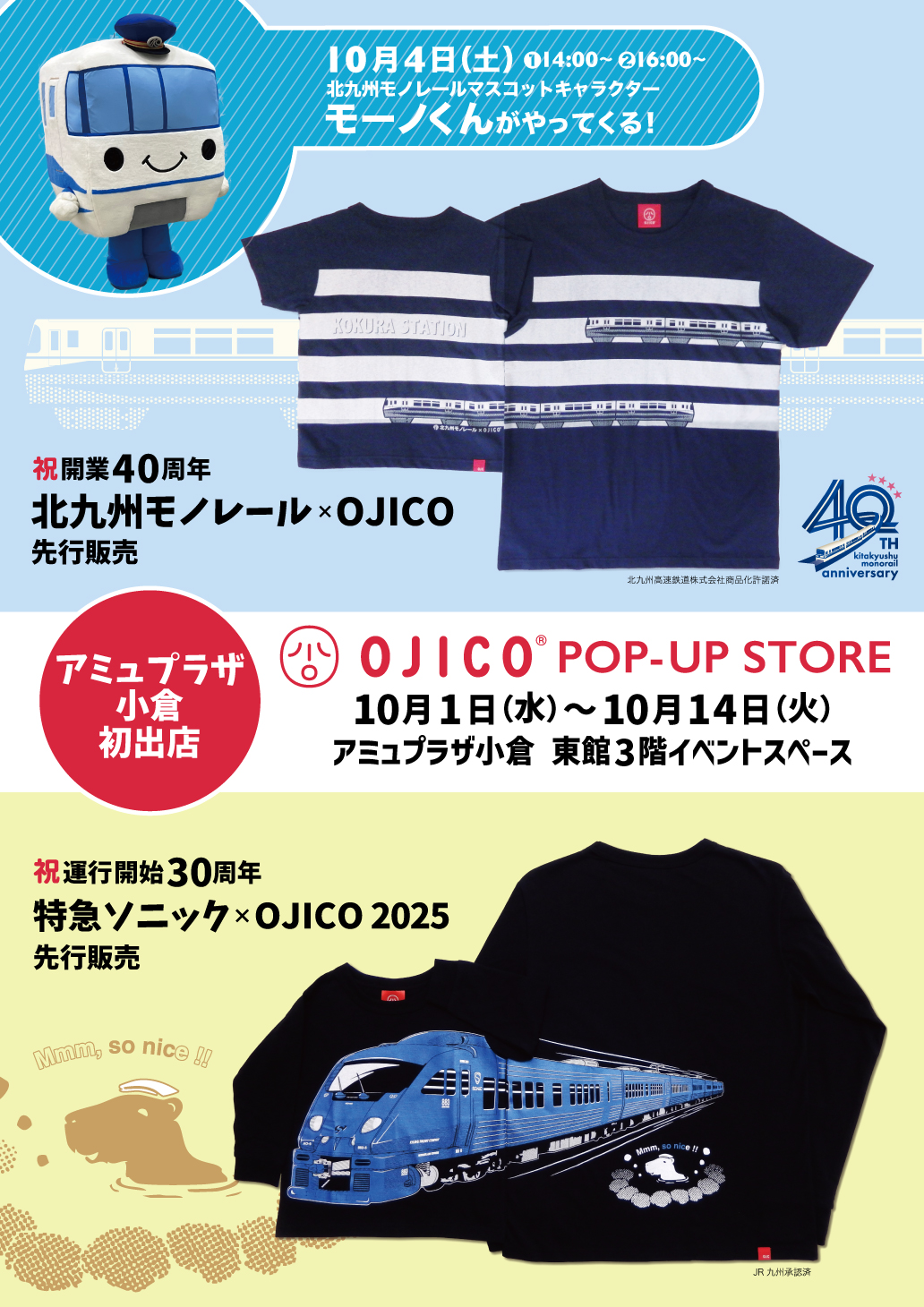 「楽しくないTシャツなんて、欲しくない。」をテーマに、遊びの詰まったデザインでアパレル・雑貨を展開する「OJICO〈オジコ〉」(有限会社チャンネルアッシュ、本社:石川県金沢市、代表取締役:越原裕幹)は、北九州モノレールの開業40周年を記念して、初のコラボとなる「北九州モノレール×OJICO Tシャツ」を発売いたします。また同時に、運行開始30周年を迎えた「特急ソニック」をモチーフにした長袖Tシャツを発売。こちらの2種のTシャツは、10月1日(水)よりアミュプラザ小倉で初開催となるOJICO期間限定ショップにて先行販売いたします。
