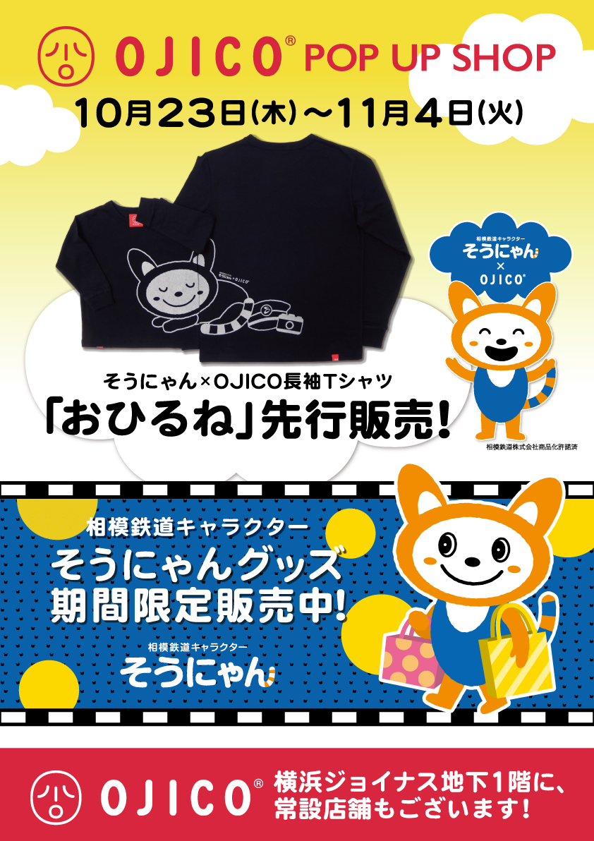 横浜駅直結の相鉄ジョイナス地下1階「OJICO横浜ジョイナス店」と、1階パパブブレ前広場で開催する「OJICO期間限定ショップ」にて10月23日(木)より先行発売いたします。また今回は「OJICO期間限定ショップ」に併設して「相模鉄道キャラクターそうにゃんグッズ期間限定ショップ」も登場いたします。